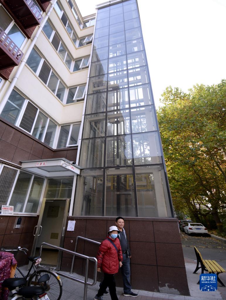这是北京市丰台区莲花池西里6号院一栋居民楼加装的外挂式电梯(11月10日摄)。