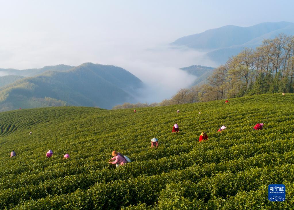 4月2日,采茶工在浙江省湖州市安吉县杭垓镇的生态茶园里采摘明前茶(无人机照片)。