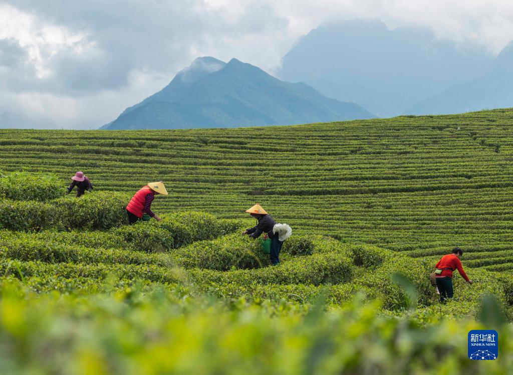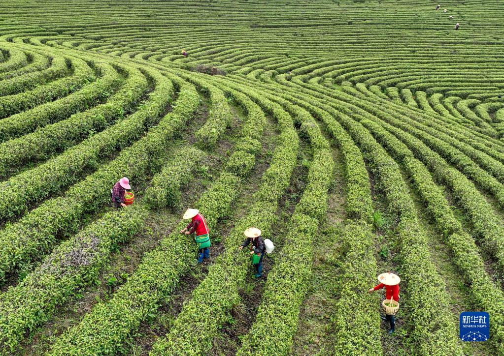 4月2日,采茶工在湖南省永州市江华瑶族自治县涛圩镇牛牯岭生态茶场采摘春茶。