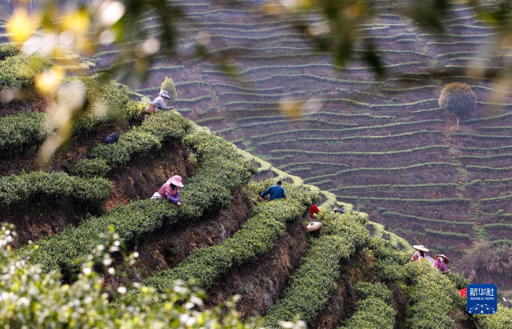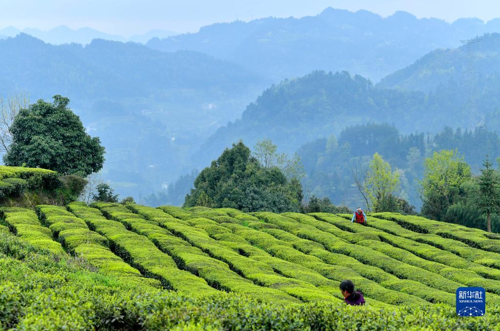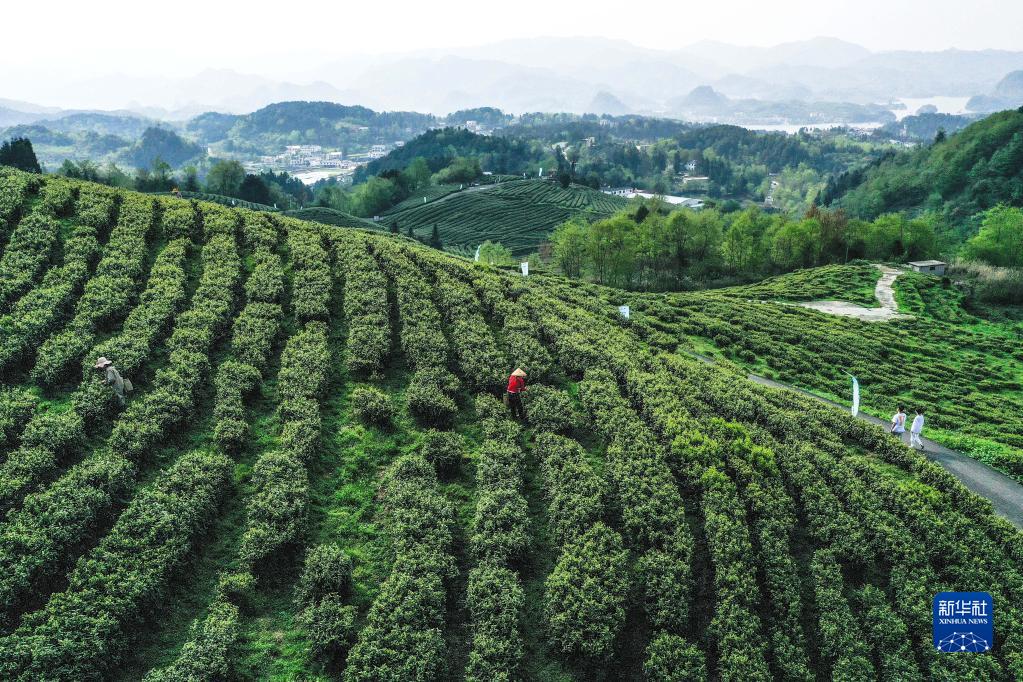 4月2日,村民在贵州省贵阳市神鹊茶场采摘春茶。