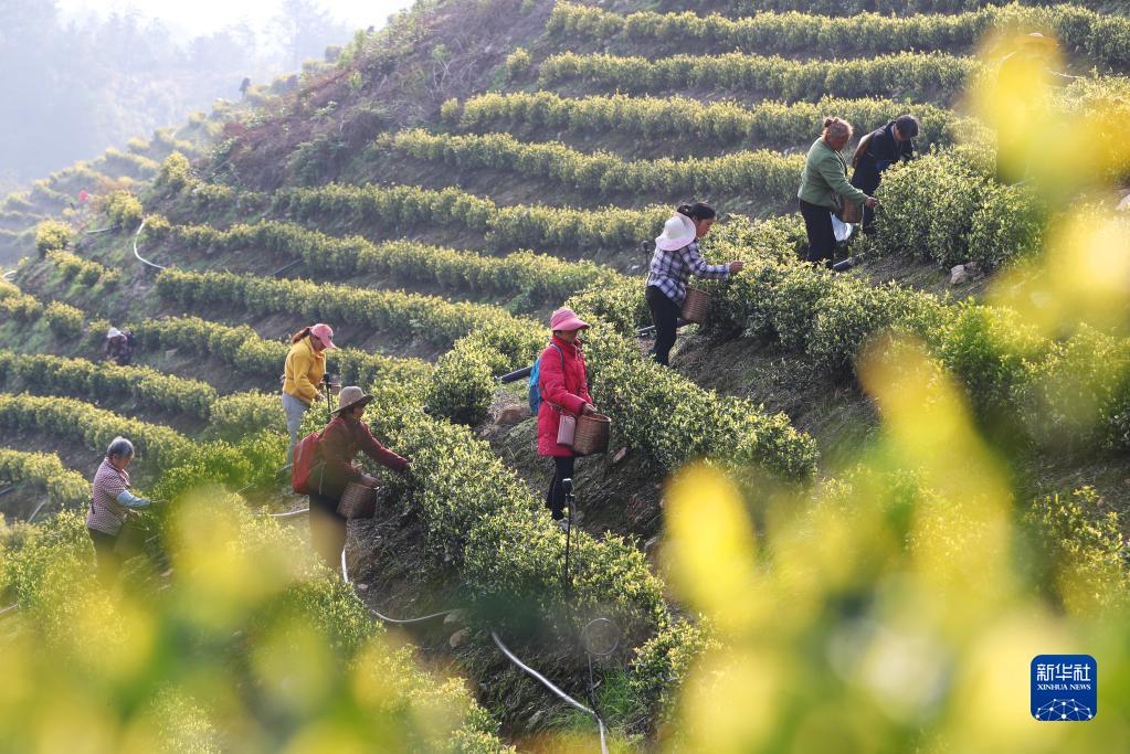 4月2日,茶农在湖北省宣恩县万寨乡的茶园里采摘茶叶。