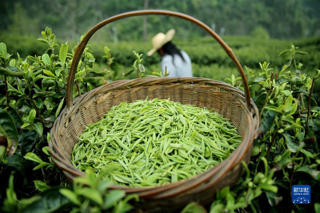 4月1日,茶农在湖南省怀化市通道侗族自治县九层岭茶园采摘明前茶。