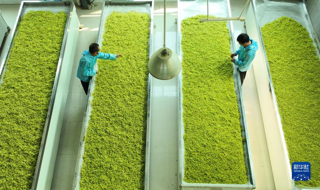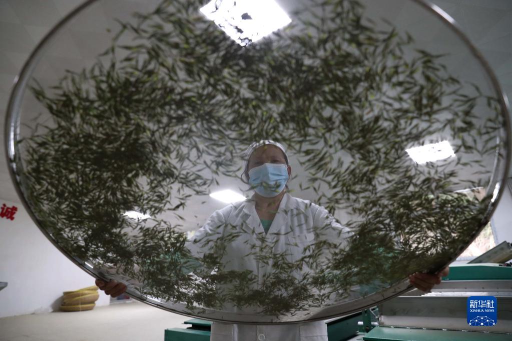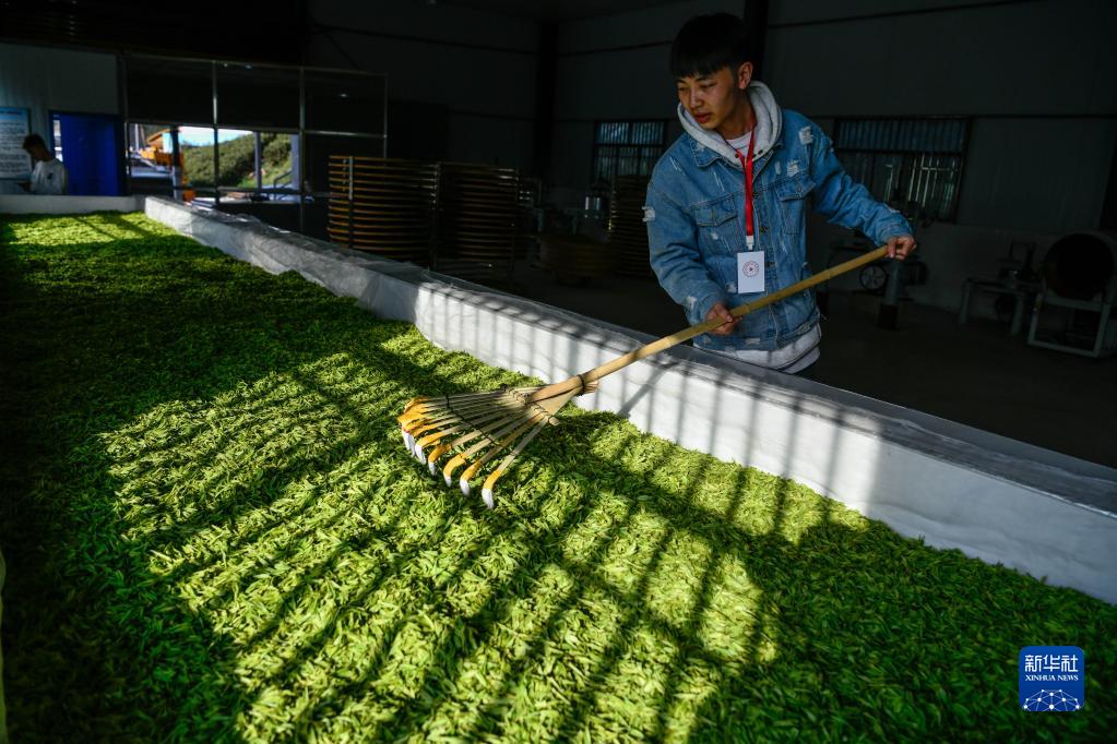 4月2日,工人在贵州省贵阳市神鹊茶场摊晾春茶。