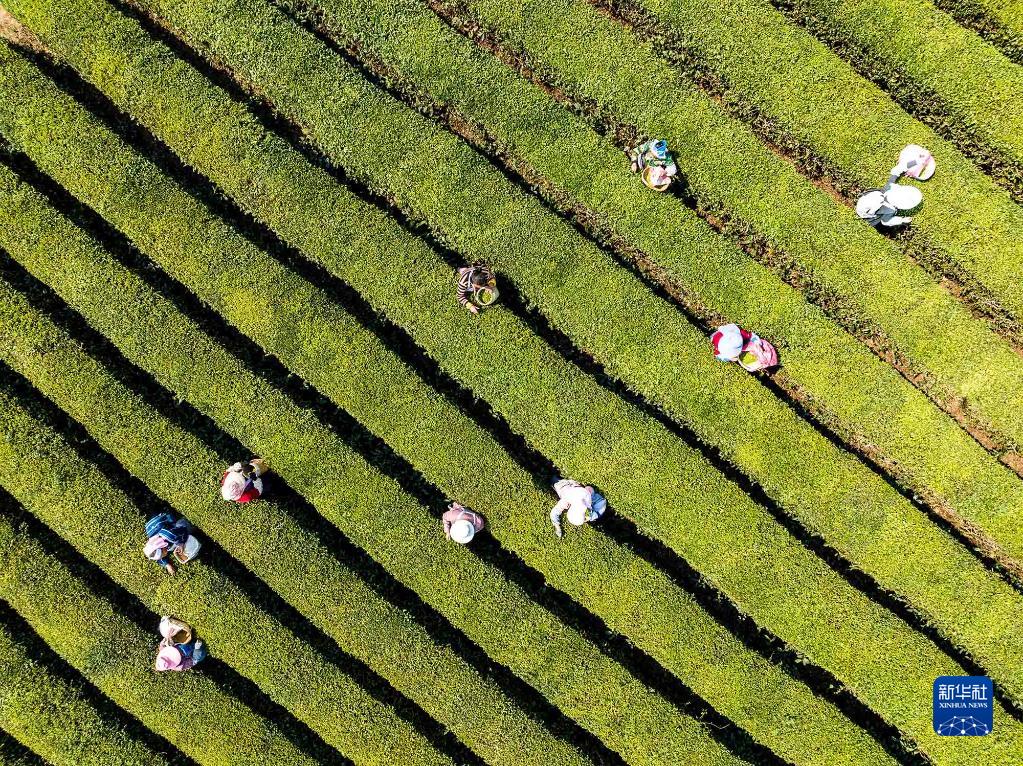 4月2日,采茶工在湖南省永州市江华瑶族自治县涛圩镇牛牯岭生态茶场采摘春茶(无人机照片)。