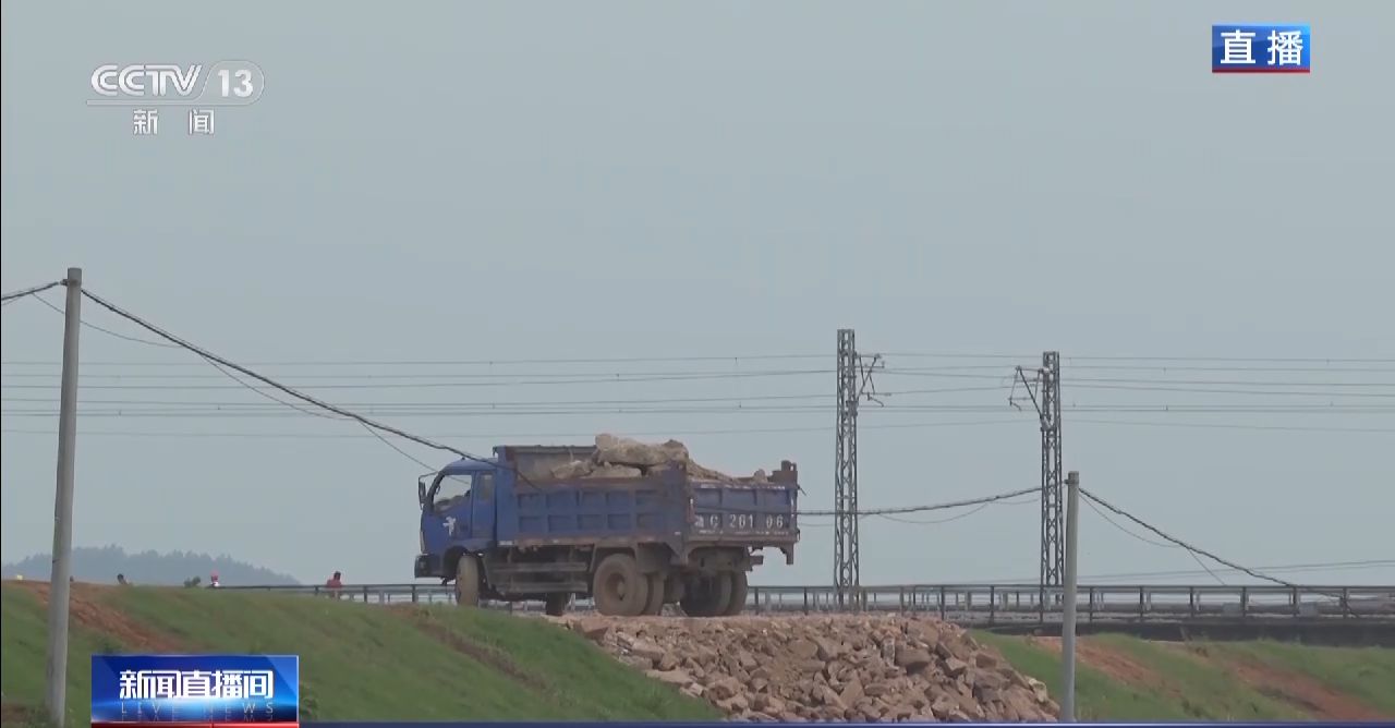 在圩堤上可以看到,拉石块的货车依次有序停放。在决口的两侧圩堤上,各有几位交警进行指挥,根据每一段路上货车行驶的情况,用对讲机沟通后决定是否放行,保证车辆有序进退。