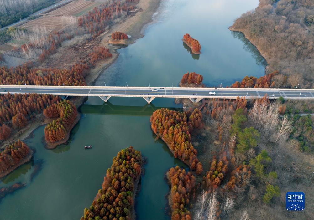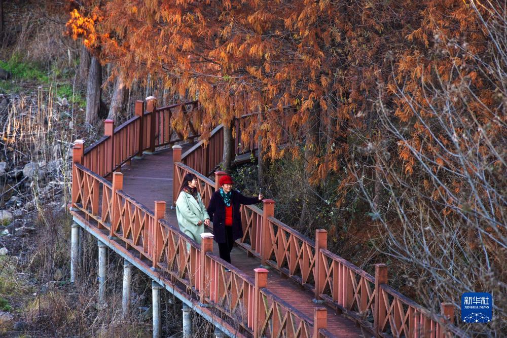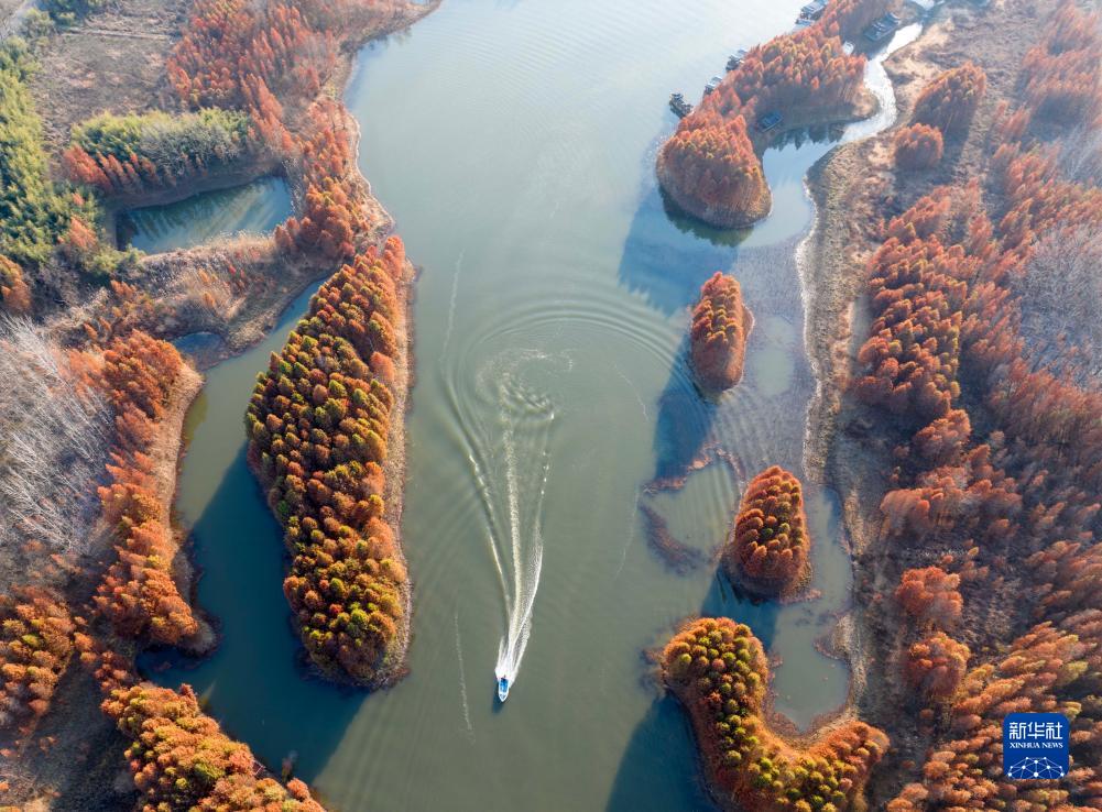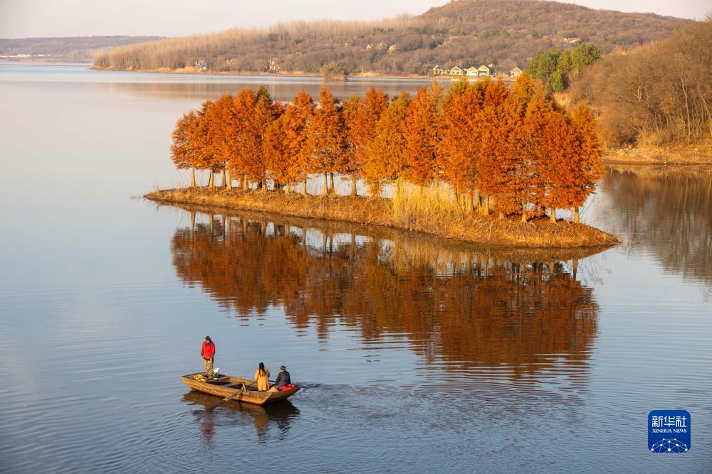 冬日时节,江苏省盱眙县天泉湖色彩斑斓,碧水与红杉相映成趣,构成一幅美丽的冬日生态画卷,吸引众多游客前来体验“人在画中游”的美感。