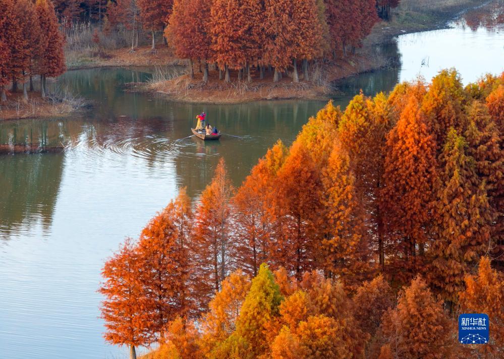12月1日,一艘小船驶过盱眙县天泉湖畔的红杉林。