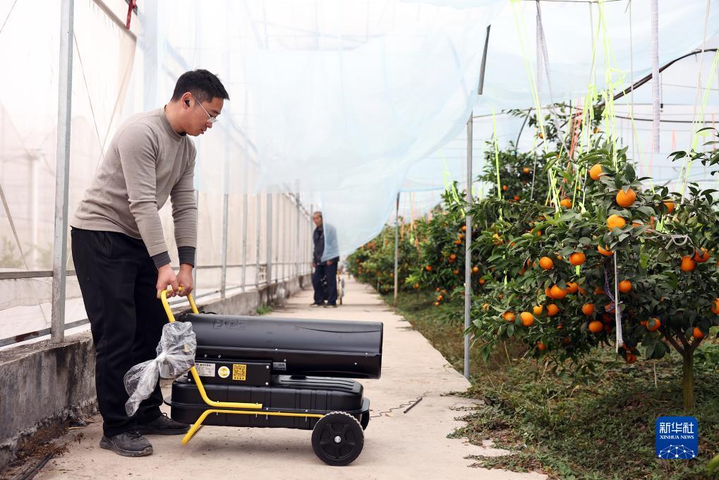 12月15日,在浙江省东阳市南马镇浙江花园农业发展有限公司大棚内,工作人员将燃油暖风机搬运到大棚内,抵御此次寒潮。