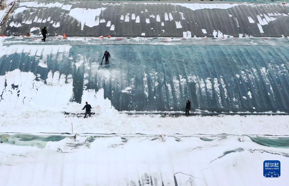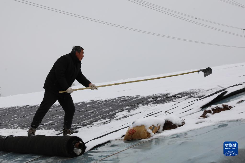 12月15日,在河南省焦作市温县张羌街道马庄村,农民在清除温室大棚上的积雪。