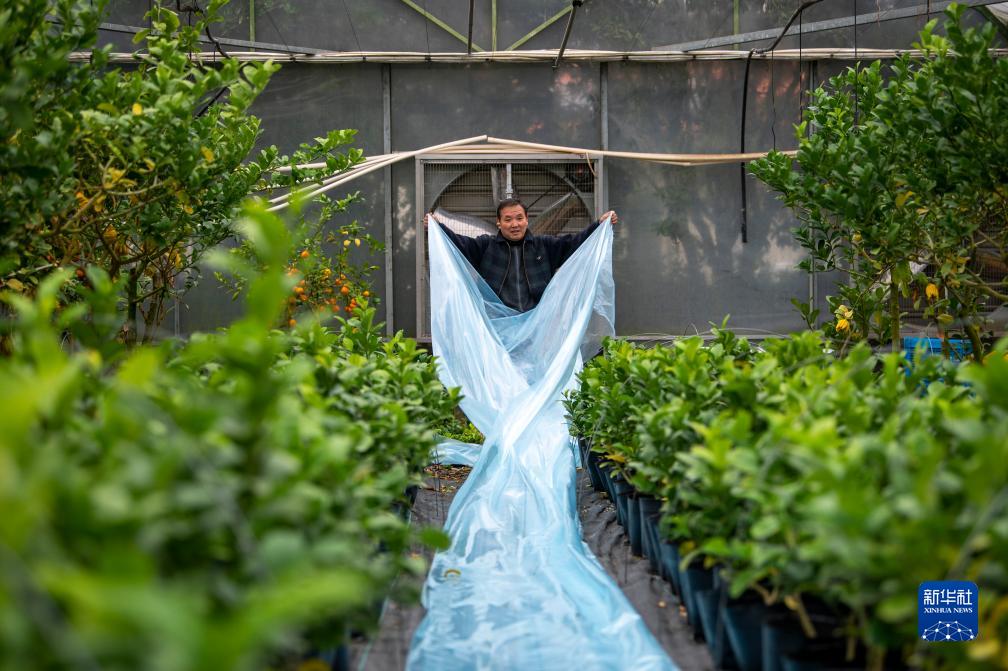 12月15日,在浙江省金华市农科院林果基地,工作人员在给佛手树苗盖膜。