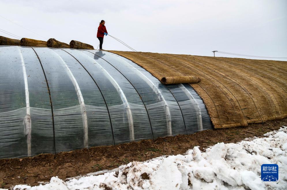 12月15日,河南省济源市思礼镇涧南庄村农民为蔬菜大棚加盖保温草帘。