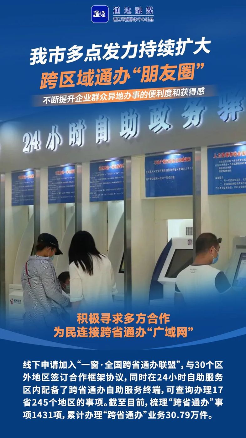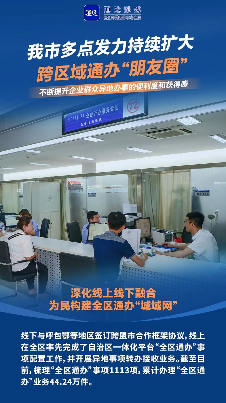 为深入推进政务服务“跨省通办”“全区通办”“全市通办”工作,内蒙古通辽市市行政审批和政务服务局不断强化政务服务交流合作,积极探索地区间“点对点跨区域通办”合作模式,切实解决企业群众“多地跑”“折返跑”难题,不断提升企业群众异地办事的便利度和获得感。