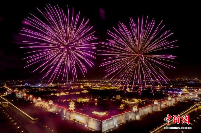 2023年1月31日,太原古县城在春节期间燃放烟火。中新社记者韦亮 摄