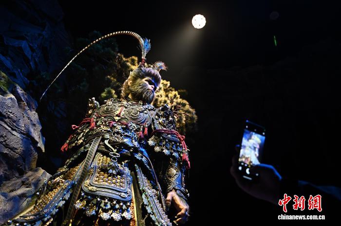 2025年10月29日,山西省太原市,媒体记者参观采访《黑神话:悟空》中的游戏角色模型。该展以游戏《黑神话:悟空》为引,将数字幻想世界与微缩古建场景融合,展现山西古建筑的魅力。中新社记者韦亮 摄