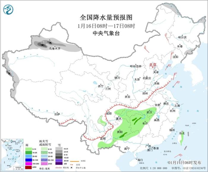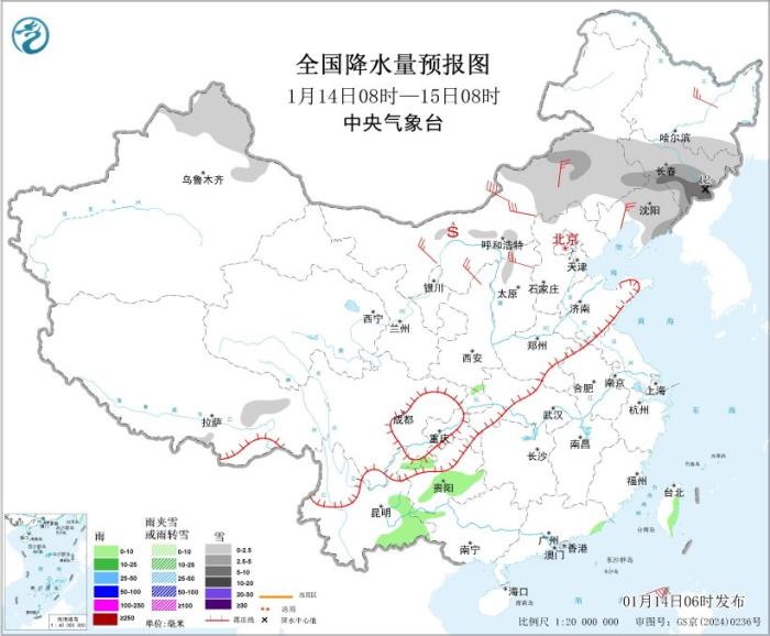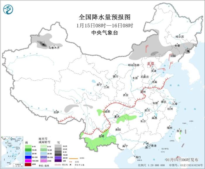 图1 全国降水量预报图(1月14日08时-15日08时)。图片来源:中央气象台网站