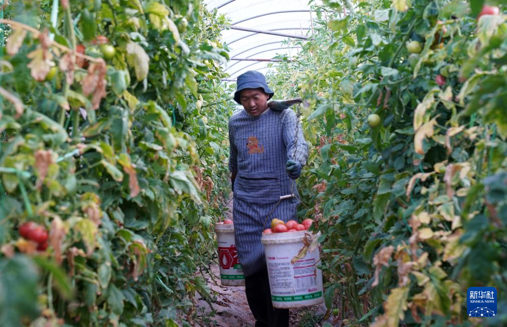 1月14日,村民在云南省元谋县蔬菜种植基地采摘番茄。