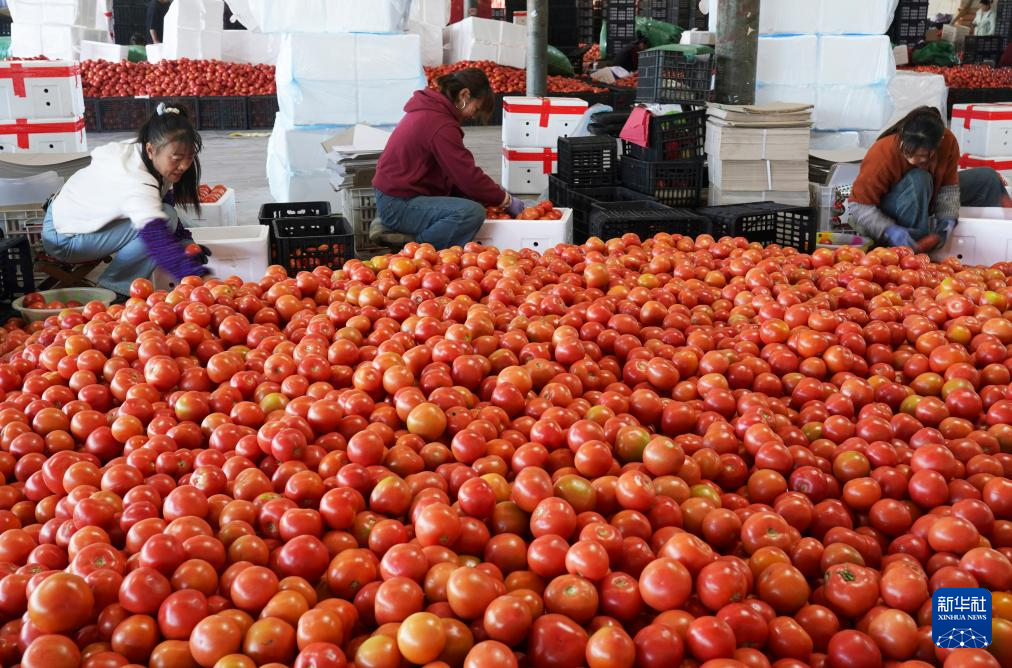 1月14日,在云南省元谋县果蔬综合批发市场,村民在分拣番茄。