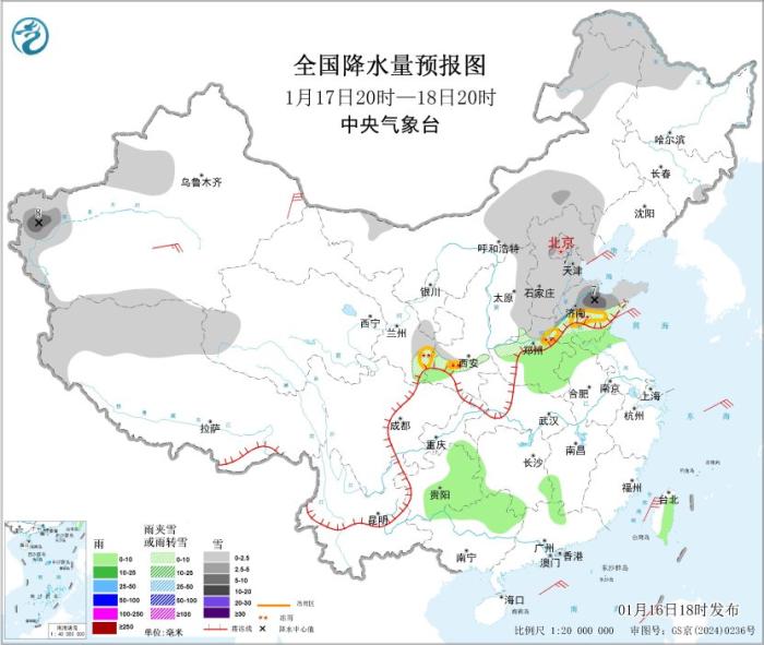 1月17日20时至18日20时,内蒙古中部和东北部、黑龙江西北部、新疆伊犁河谷和南疆西部山区、西藏北部、青海西部、西北地区东南部、华北、黄淮等地部分地区有小到中雪或雨夹雪,其中,新疆南疆盆地和西部山区、山东中部等地部分地区有大雪(5~8毫米),山东中部、河南东北部、甘肃东南部和陕西南部等地部分地区有冻雨。山东南部、河南中南部、安徽北部、江苏北部、贵州中东部、广西北部、湖南南部、台湾岛东部等地部分地区有小雨。新疆南疆盆地和东部等地部分地区有4~6级风,台湾海峡、巴士海峡、南海海域有5~7级大风、阵风8级。