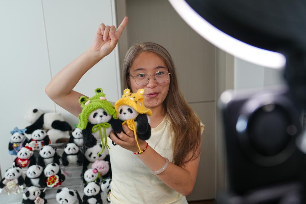 2025年8月10日,在位于成都市武侯区的四川熊猫滚滚科技有限公司直播间,主播在某电商平台直播销售“大熊猫IP”包挂产品,据统计,今年1-7月,该公司包挂产品销售额达到1200万元。新华社发(翁光建摄)