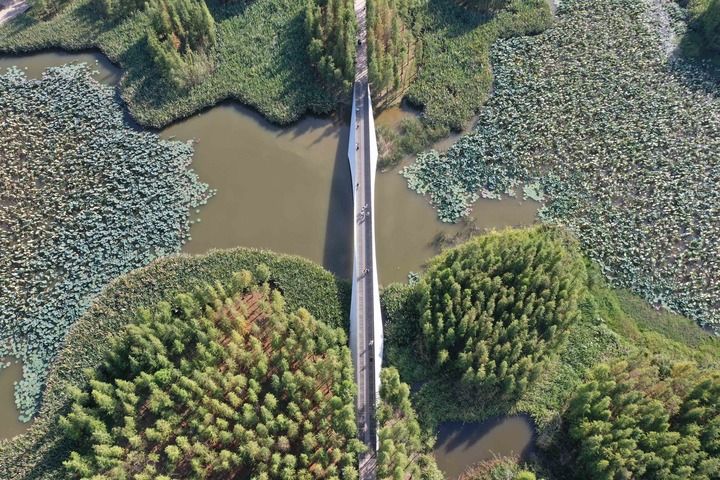 2024年10月3日,游客们正在南昌高新区鱼尾洲公园游玩。鱼尾洲公园是一个由鱼塘和粉煤灰堆积场改造而来的城市湿地公园。新华每日电讯记者周密摄