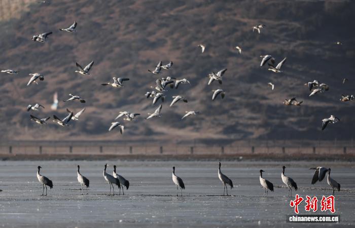 1月23日,黑颈鹤与斑头雁在纳帕海共舞。 黄兴鸿 摄