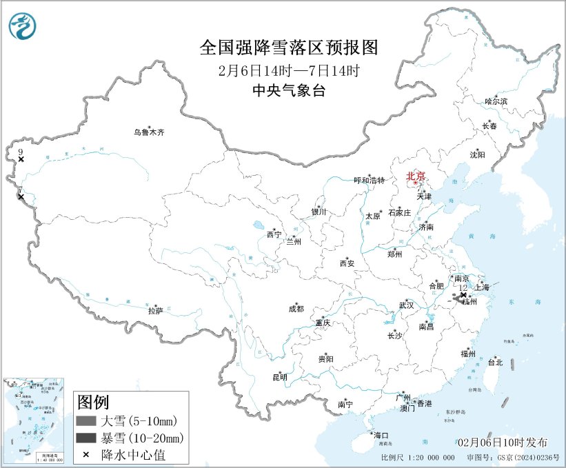 暴雪蓝色预警:预计2月6日14时至2月7日14时,安徽南部、浙江北部等地部分地区有大雪,山区局地有暴雪(10~12毫米)。上述部分地区新增积雪深度1~3厘米,局地可达5厘米以上。