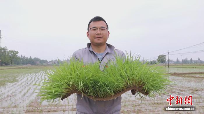 在湖南益阳,段照展示秧苗。(受访者供图)