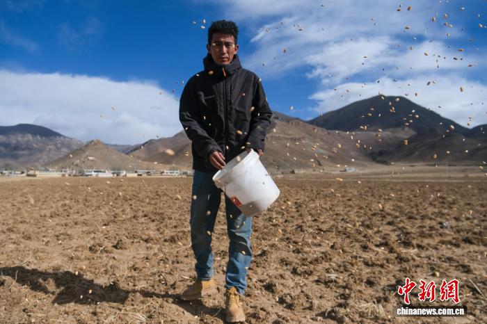 2月8日,西藏拉萨林周县黑颈鹤巡护员桑珠在田间播撒小麦,为黑颈鹤补充食物。 中新社记者 江飞波 摄
