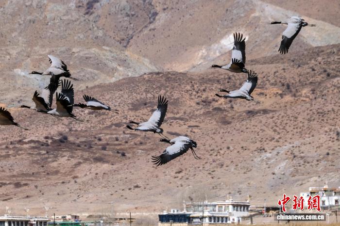 2月8日,一群越冬黑颈鹤飞过拉萨市林周县春堆乡卡东村上空。 中新社记者 江飞波 摄