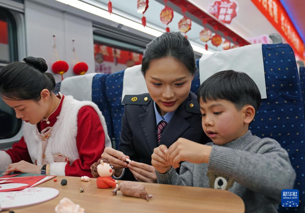 2月10日,列车工作人员陪小旅客捏橡皮泥。