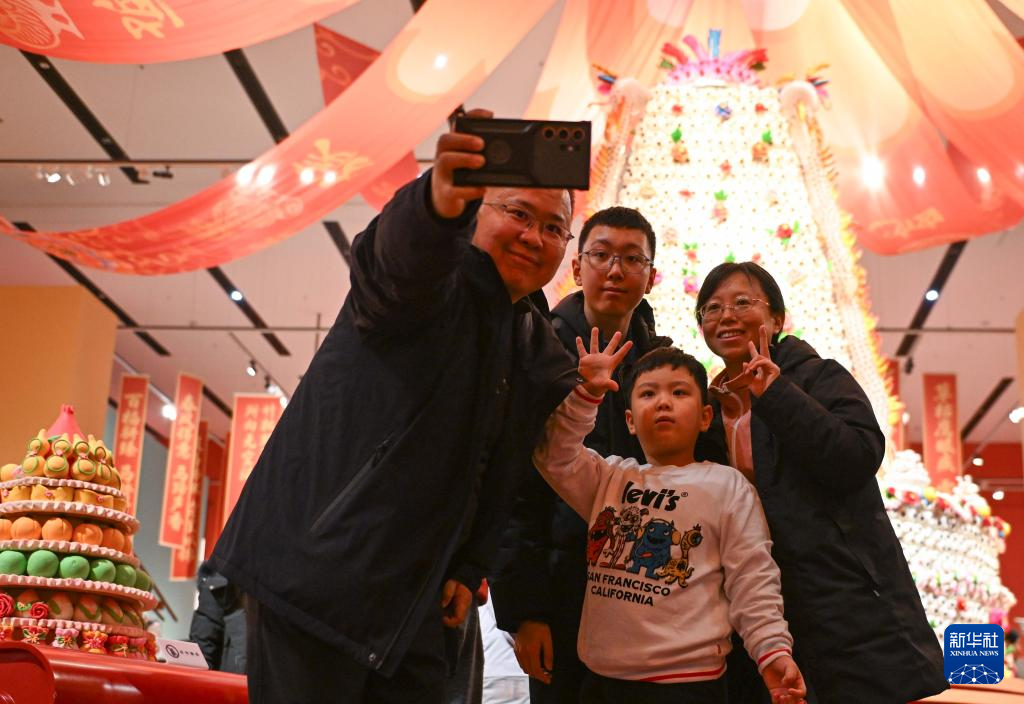2月15日,观众在“过年——丙午春节系列主题展”上观看陕西非遗代表性项目澄城面花作品“大鼓枣山”。