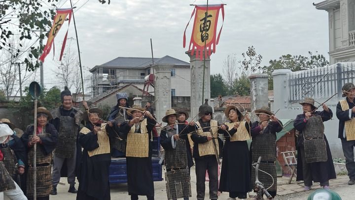 凉席拼成铠甲,锅盖当作盾牌,电动车成了赤兔马,粪勺化身青龙偃月刀……在这个由村民自发组成的“夕阳红剧组”里,一切道具就地取材。没有专业灯光,剧组举着手机跟拍;没有提词器,台词靠口口相传,一句话拍十几遍是常事,但现场笑声不断。