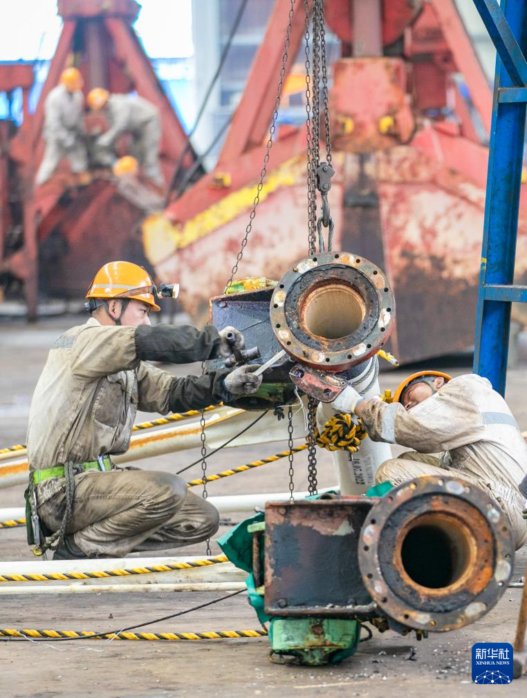 2月24日,在浙江舟山中远海运重工有限公司船舶装配现场,工人在生产作业中。