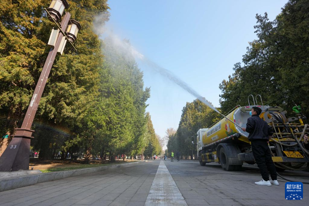3月15日,在北京地坛公园,工作人员使用添加了花粉固定剂的水对柏树进行喷淋。