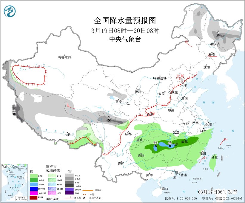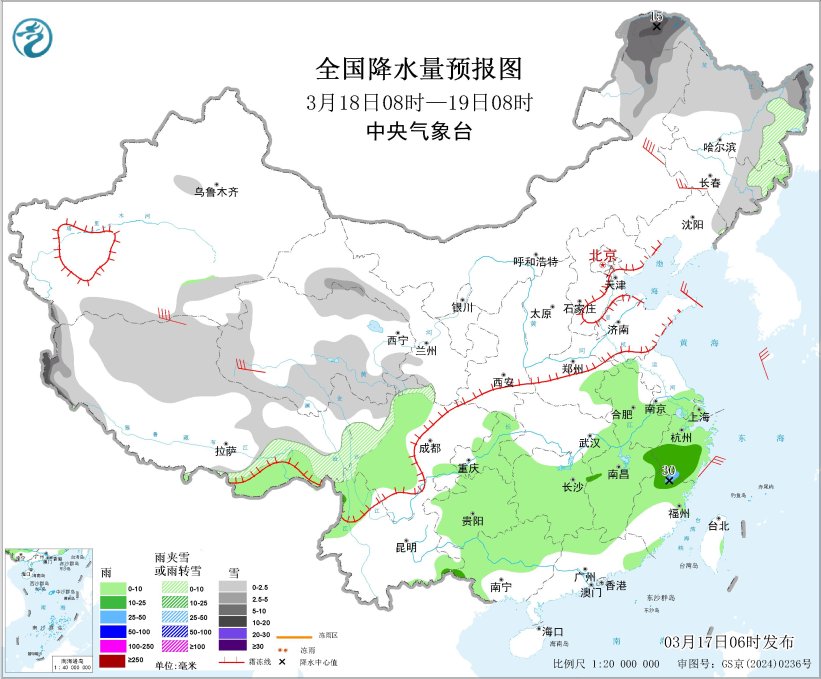 3月18日08时至19日08时,内蒙古东北部、东北地区东部和北部、新疆南疆南部、西藏西部和北部、青海西部和南部、川西高原中北部、甘肃河西等地部分地区有小雪或雨夹雪,其中,内蒙古东北部、黑龙江西北部和东部、西藏西部山区等地部分地区有中到大雪,局地暴雪(10~15毫米)。江淮西部、江南大部、西南地区东部和北部、华南北部和西部等地部分地区有小到中雨,其中,浙江南部、福建西北部等地部分地区有大雨(25~30毫米)。吉林中部、青海西部等地部分地区有4~6级风,其中,内蒙古东北部、西藏北部等地部分地区有6~7级风;东海北部、渤海、渤海海峡、黄海大部等部分海域将有5~6级风、阵风7级。