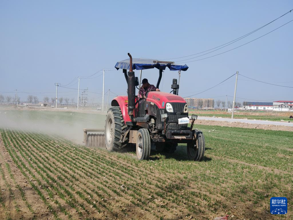 在河北省保定市望都县,农民驾驶镇压锄划机进行作业。新华社记者王昆 摄