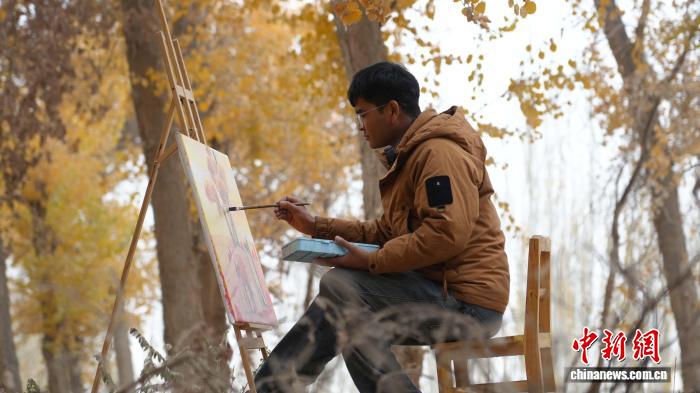 乃比江·阿布都热合曼在当地胡杨林中作画。(资料图) 受访者供图