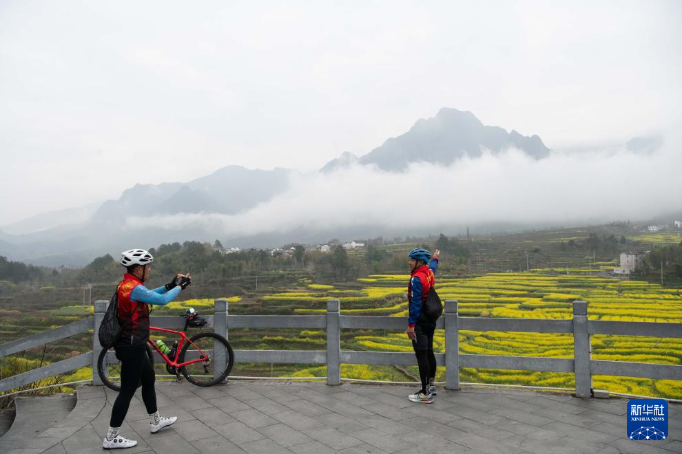 3月23日,骑行爱好者在幸福村梅干岭油菜花田附近的观景台拍照。