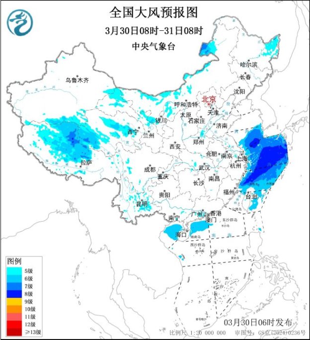 另外,30日白天至夜间,黄海中部海域将有能见度不足1公里的大雾;30日早晨至上午,黄海南部海域、东海西部海域、江苏沿海、浙江沿海、福建北部沿海、长江口及杭州湾附近海域将有能见度不足1公里的大雾。受入海气旋影响,30日午后至夜间,东海、黄海南部等海域将有7~8级、阵风9~10级的大风。需关注低能见度天气及大风对交通安全的不利影响。
