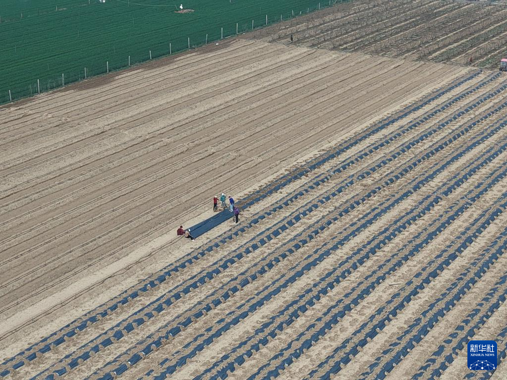 3月28日,河南省焦作市温县黄河街道东张王庄村村民在田间覆盖地膜(无人机照片)。
