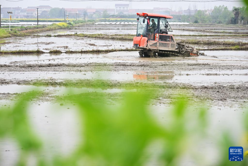 3月29日,在湖南省常德市澧县梦溪镇梦溪寺社区,农民驾驶耕整机械整理稻田。