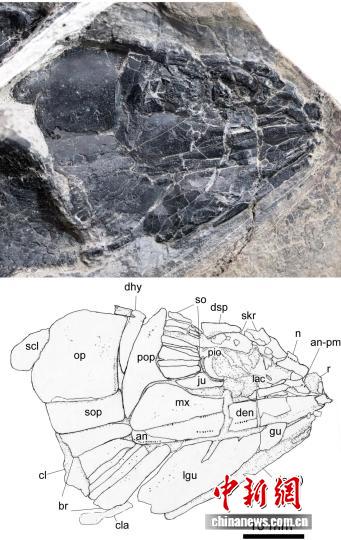 霍氏褶鳞鱼化石头骨及素描图。徐光辉 供图
