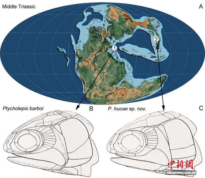 中三叠世褶鳞鱼属古地理分布图。徐光辉 供图