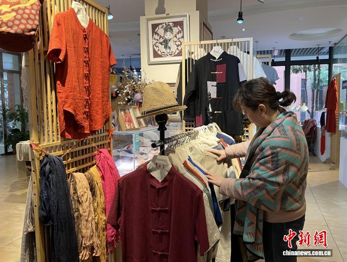 2月5日,重庆市民在“壹秋堂”非遗工坊内挑选夏布产品。中新社记者 钟旖 摄