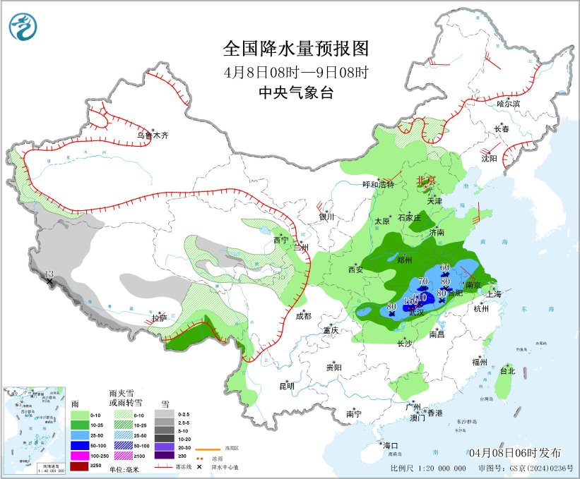 4月8日08时至9日08时,新疆南疆西部山区、西藏西部和南部、青海东部和南部、川西高原北部、内蒙古东南部等地部分地区有小到中雪或雨夹雪,其中,西藏西部局地有暴雪(10~13毫米);西藏东南部、山西南部、河北南部、北京西部和南部、河南大部、山东南部、江汉大部、江淮大部等地部分地区有中到大雨,其中,河南南部、安徽中部、湖北南部和东部等地部分地区有暴雨或大暴雨(100~150毫米)。新疆东部和南疆盆地、内蒙古、甘肃东部、宁夏北部、吉林中西部、辽宁北部以及西藏大部、川西高原、云南、贵州等地部分地区有5~7级风,阵风8~9级;黄海中部和南部海域、东海西北部海域有7级风,阵风8级。