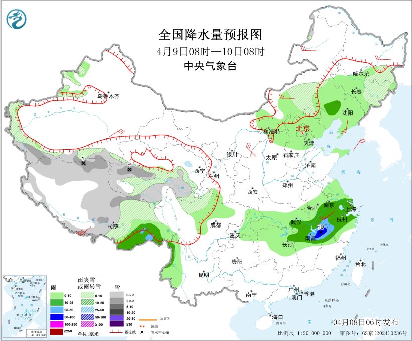 4月9日08时至10日08时,新疆南疆盆地、西藏大部、青海南部和西部、川西高原北部、内蒙古东部、黑龙江东南部、吉林东部等地部分地区有小到中雪或雨夹雪,其中,西藏北部、青海西部等地部分地区有大雪(5~9毫米);西藏东南部、湖北东南部、苏皖南部、上海、浙江北部、江西北部等地部分地区有中到大雨,其中,江西北部等地部分地区有暴雨(50~60毫米)。新疆北疆北部和南疆盆地、内蒙古中东部、宁夏、陕西北部、山西中北部、黑龙江北部以及西藏大部、云南等地部分地区有5~7级风,阵风8~9级;黄海南部海域、东海北部和西南部海域有7级风,阵风8级。
