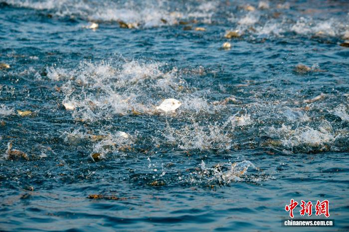图为金鲳鱼跃出水面竞食。翟李强 摄