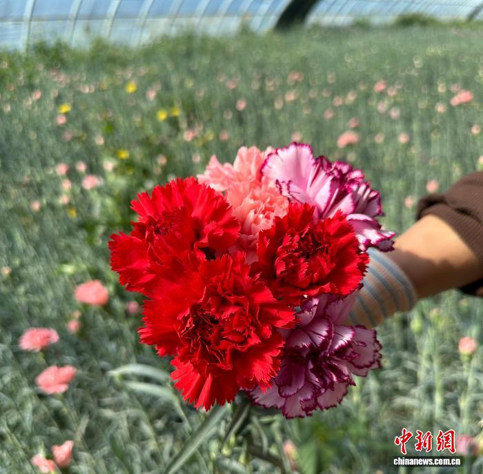 中新网兰州4月8日电 (丁思田鹏鹤)清明小长假期间,鲜花消费需求持续攀升,订购量大幅增加。在甘肃武威市凉州区清水镇“深花巷子”鲜切花产业园内,一束束康乃馨含苞待放、缀满枝头,村民们有条不紊地忙着采摘、分拣、包装,花店经营者则直接进驻园区“抢单”。
