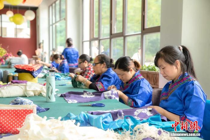 图为位于重庆市石柱土家族自治县中益乡的非遗工坊内,乡村手艺人赶制订单。受访者供图