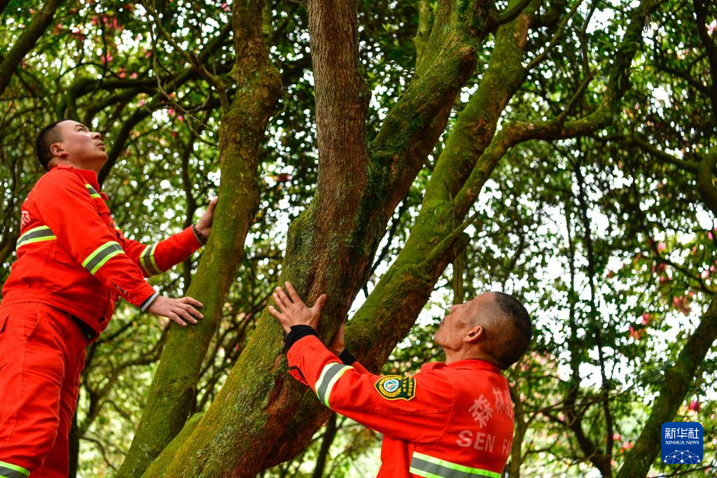 在贵州百里杜鹃管理区金坡景区,森林防火队员在查看一棵杜鹃树病虫害防治情况(4月2日摄)。